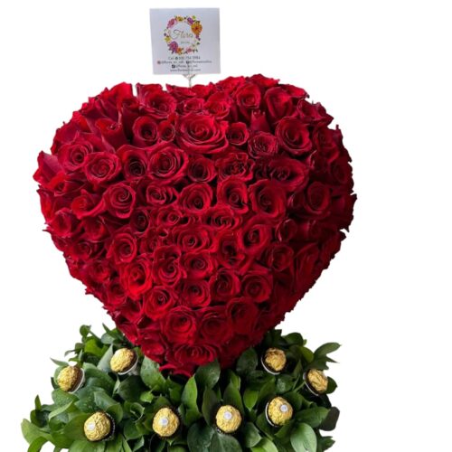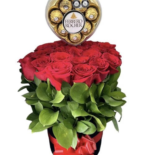 CILINDRO DE ROSAS CON CHOCOLATES FERRERO EN FORMA DE CORAZÓN