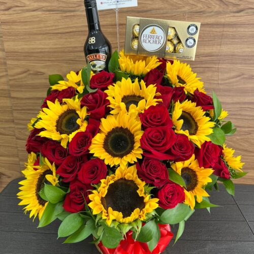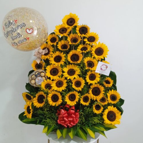 ARREGLO DE GIRASOLES CON GLOBO PERSONALIZADO Y CHOCOLATES FERRERO